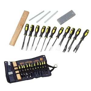 Complete premium-grade chisel set with canvas lift and storage case - a very good software value Eleven 9" chisels, hardened high-carbon steel blades with rubberized soft-grip deal withs Blade styles include vast & slender flat, sphericaled, concave, corner, straight and offset Dual-grit aluminum oxide whetstone plus round, flat & triangular silicon carbide sharpening stones Rugged poly-canvas case with elastic pockets to keep all geared up & protected; 12" hardwood striker